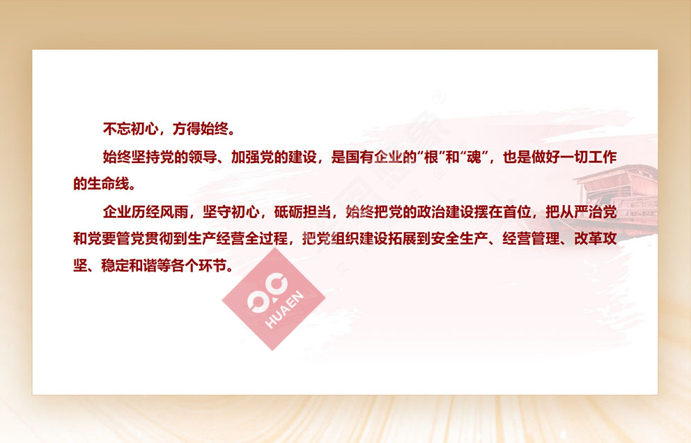 設(shè)計(jì)理念:不忘初心,方得始終。始終堅(jiān)持黨的領(lǐng)導(dǎo)、加強(qiáng)黨的建設(shè),是國(guó)有企業(yè)的"根"和"魂”,也是做好一切工作的生命線。企業(yè)歷經(jīng)風(fēng)雨,堅(jiān)守初心,砥礪擔(dān)當(dāng),始終把黨的政治建設(shè)擺在首位,把從嚴(yán)治黨和黨要管黨貫徹到生產(chǎn)經(jīng)營(yíng)全過(guò)程,把黨組織建設(shè)拓展到安全生產(chǎn)、經(jīng)營(yíng)管理、改革攻堅(jiān)、穩(wěn)定和諧等各個(gè)環(huán)節(jié)。